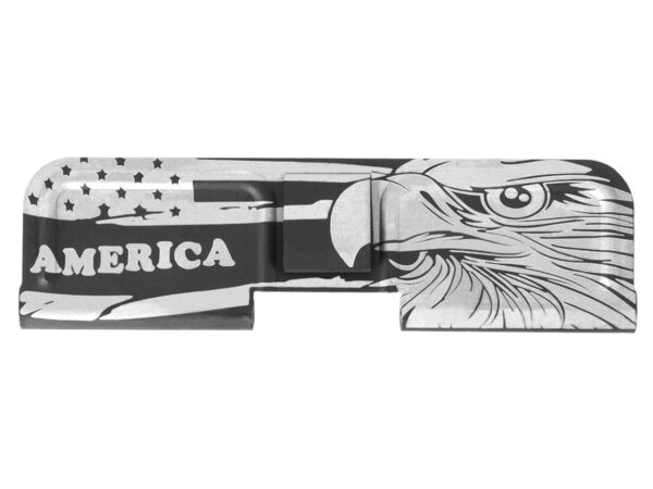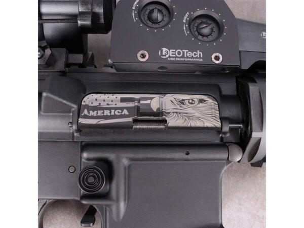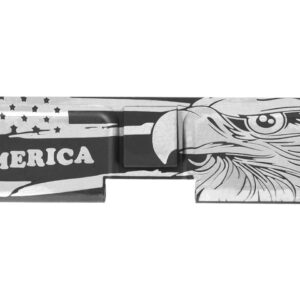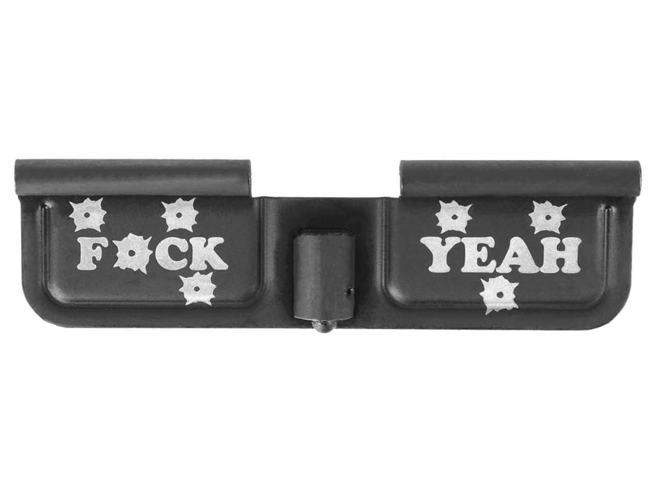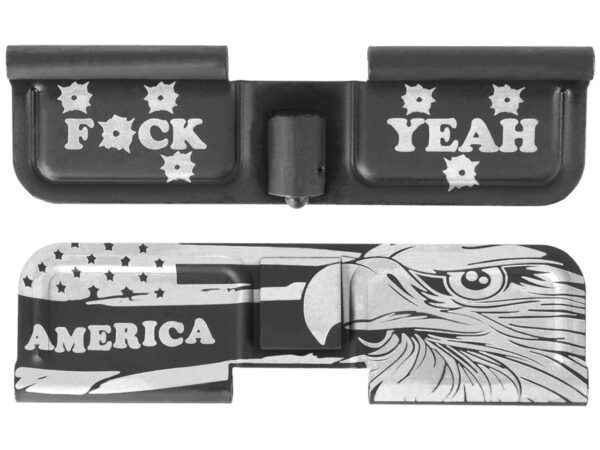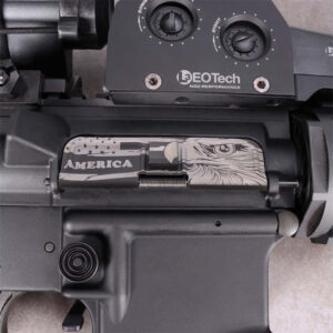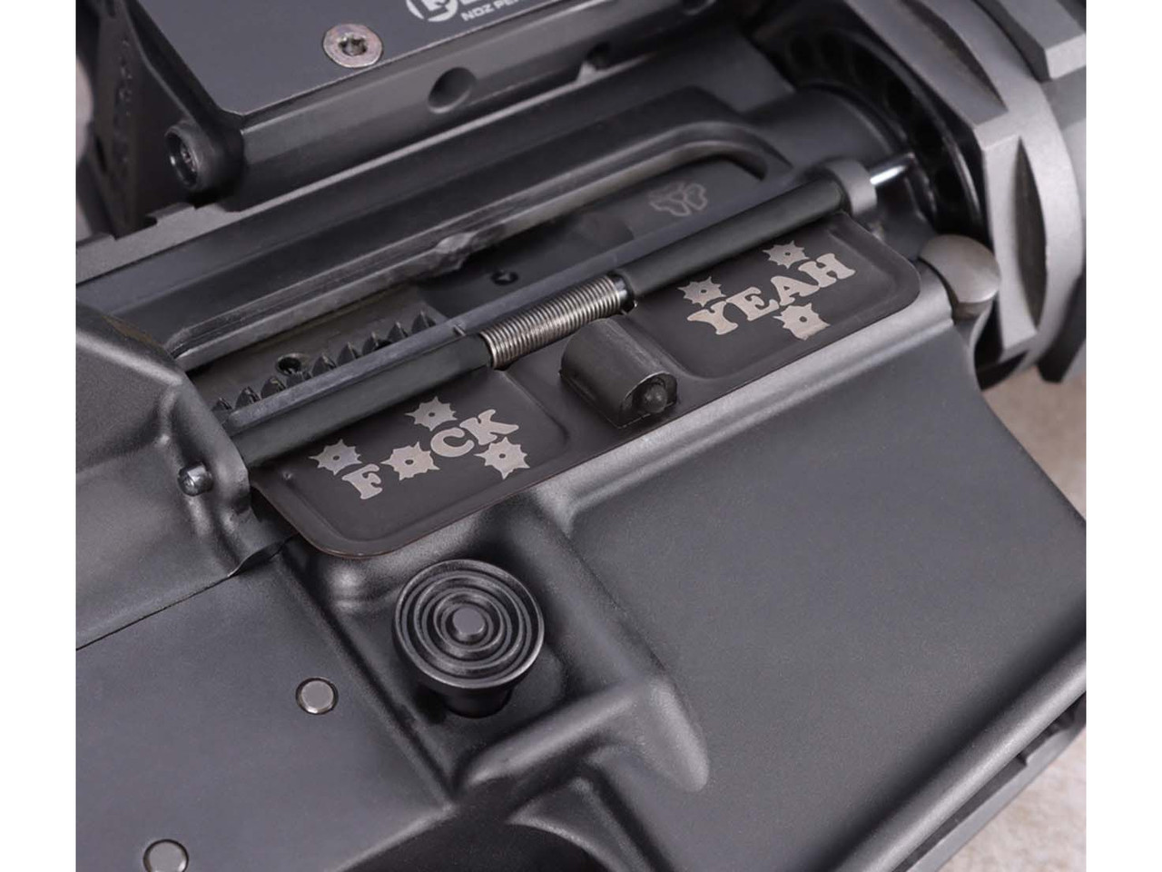 Who doesn’t like some patriotism on their gun? Our new Full Art artwork for the AR-15 covers the whole outside and inside of the dust port cover. This engraving will give your build a patriotic and unique aesthetic. Etched into the anti-glare finish is an American flag and eagle with the words F Yeah on the inside. This artwork stands out with a brilliant metallic shine against the black-coated rifle body. Complete your build today with this design!